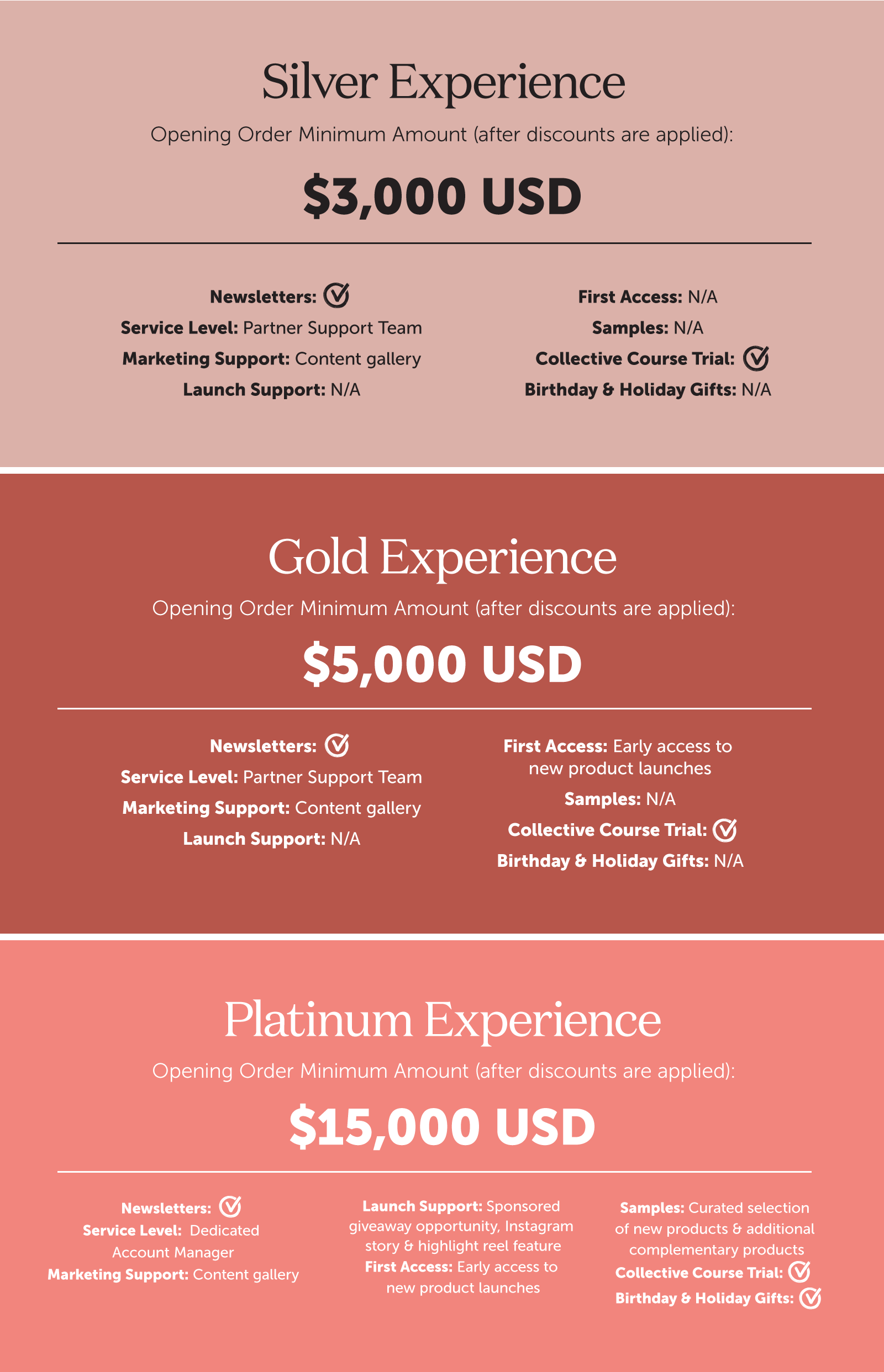 Our Partnerships team will provide you with your perks & benefits accordingly via email. If you qualify for our Platinum tier, your dedicated account manager will reach out with more details.